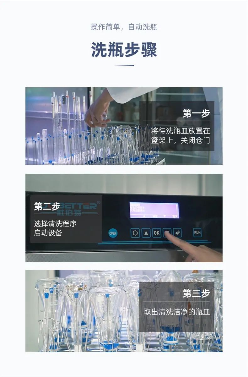 (2)它嚴(yán)格執(zhí)行設(shè)定好的清洗程序,更系統(tǒng)化、精細(xì)化、標(biāo)準(zhǔn)化。而人工清洗難免會(huì)因?yàn)榍逑慈藛T經(jīng)驗(yàn)、經(jīng)歷等問(wèn)題,難以實(shí)現(xiàn)標(biāo)準(zhǔn)化清洗。并且一些瓶皿清洗要求上不能使用刷子等工具,無(wú)疑也增加了人工清洗難度。